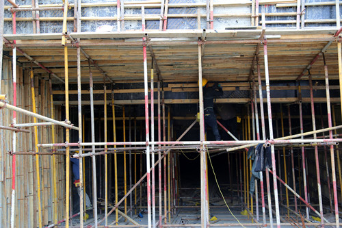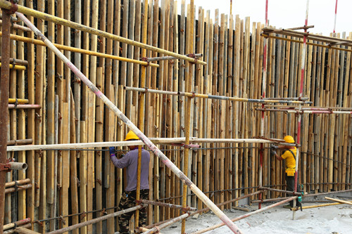 目前東安家苑主樓二次結(jié)構(gòu)砌筑,煙道、風(fēng)道安裝,構(gòu)造柱模板支設(shè)、混凝土澆筑,二號(hào)坡道口剪力墻鋼筋綁扎、模板支設(shè),地庫南側(cè)剪力墻防水施工、管道安裝。