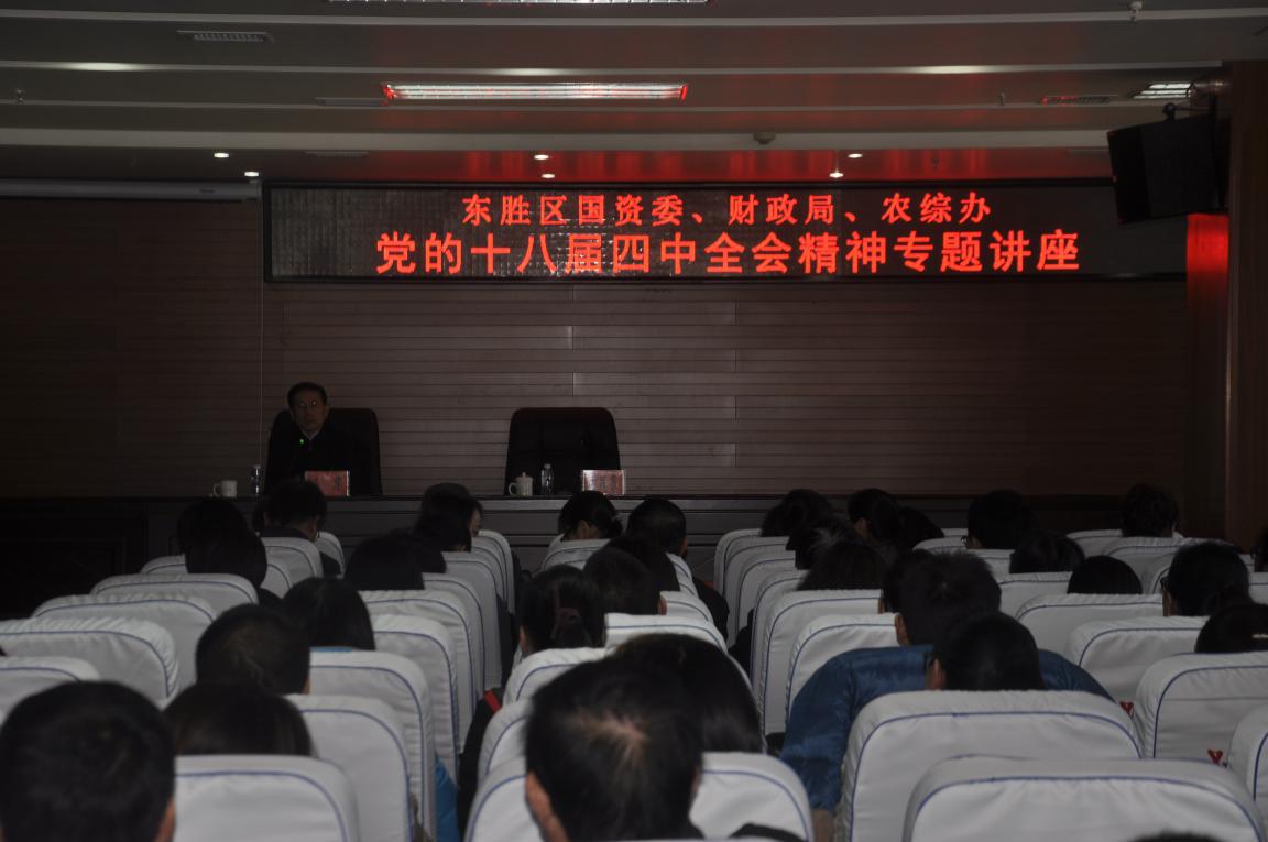 為深入學(xué)習(xí)宣傳貫徹黨的十八屆四中全會精神,進(jìn)一步提高黨員干部對依法治國的重要性認(rèn)識。12月18日下午,弘基煒業(yè)控股集團(tuán)全體黨員、入黨積極分子、環(huán)節(jié)以上干部參加了由東勝區(qū)國資委、財政局、農(nóng)綜辦聯(lián)合舉辦的專題學(xué)習(xí)會,會議邀請了東勝區(qū)講師團(tuán)王華團(tuán)長作“黨的十八屆四中全會精神”專題講座。國資委黨委書記王茂泉主持學(xué)習(xí)會。
