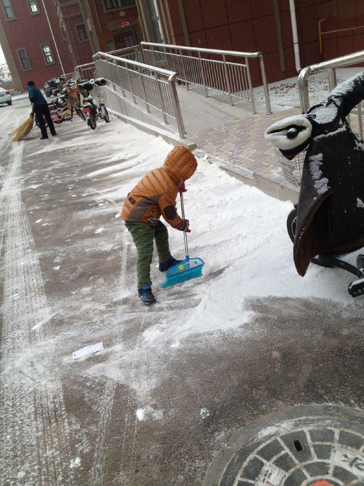 看我們這名勇敢熱心的小業(yè)主,掃的還有模有樣呢