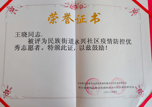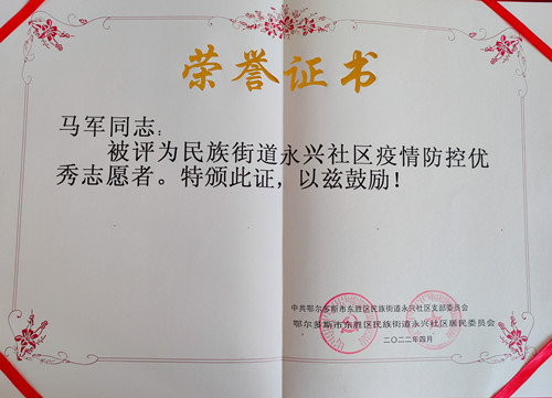 同時,為我們的工程人員王曉和馬軍送上“疫情防控優(yōu)秀志愿者”的證書,對他們沖鋒在前,堅守一線,默默付出表示了感謝。