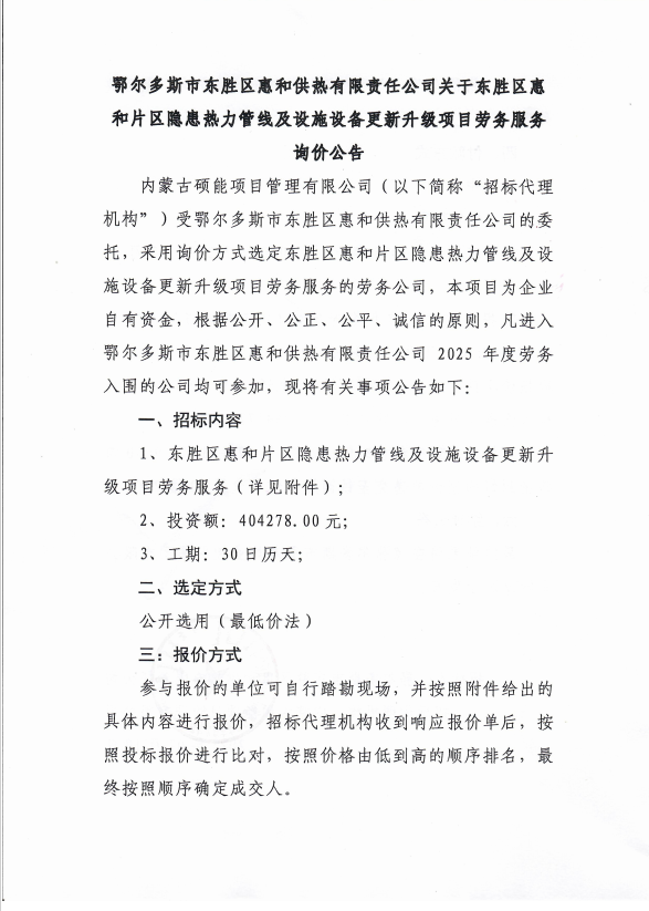 鄂爾多斯市東勝區(qū)惠和供熱有限責(zé)任公司關(guān)于東勝區(qū)惠 和片區(qū)隱患熱力管線及設(shè)施設(shè)備更新升級(jí)項(xiàng)目勞務(wù)服務(wù) 詢價(jià)公告